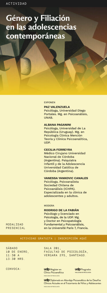 « Todos los Eventos Este evento ha pasado. ACTIVIDAD: GÉNERO Y FILIACIÓN EN LAS ADOLESCENCIAS CONTEMPORÁNEAS enero,10 /11:30 - 13:30 « Simposio Doctoral Mujeres Líderes en Salud: Experiencias, Barreras y Desafíos Metodológicos en la Investigación Simposios de Investigación: PROTEGE: I+D para la protección especializada de la infancia y adolescencia » INSCRIPCIONES AQUÍ Añadir al calendario Google Calendar iCalendar Outlook 365 Outlook Live Detalles Fecha: enero,10 Hora: 11:30 - 13:30 Categoría del Evento: Actividades Facultad Local SALA 201 Facultad de Psicología UDP Vergara 275 Santiago, Santiago Chile + Google Map