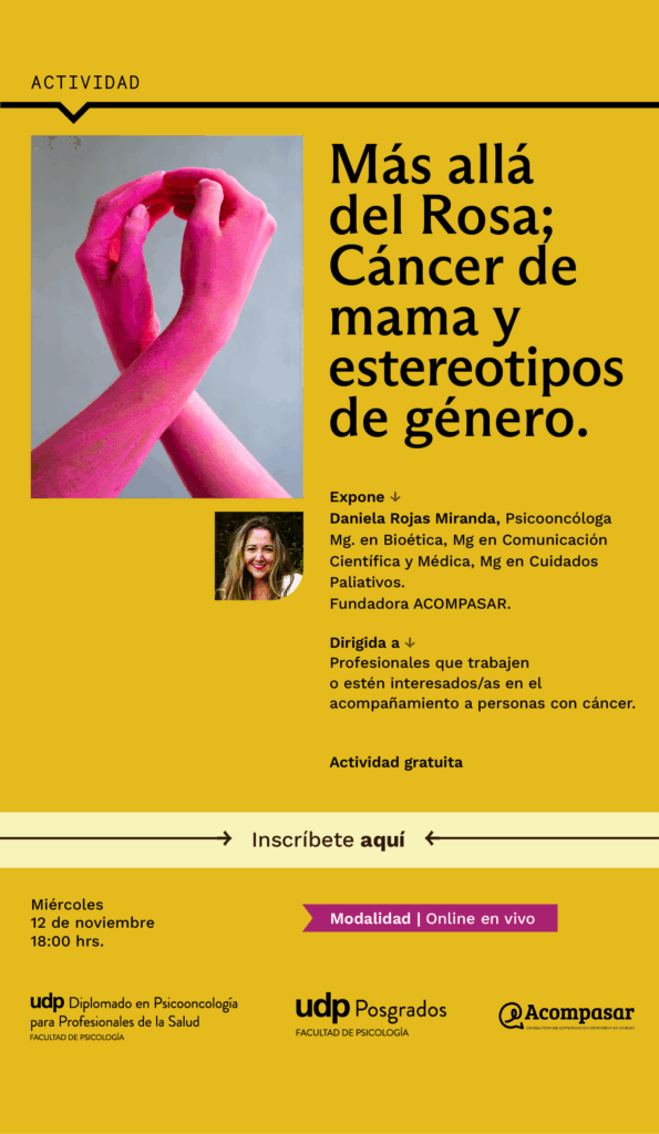 « Todos los Eventos MÁS ALLÁ DEL ROSA; Cáncer de mama y estereotipos de género. noviembre,12 /18:00 « COLOQUIO PEPET “El costo invisible del cambio en las organizaciones: Liderazgo, transformación y salud mental” Diálogo Intergrupal » INSCRIPCIONES AQUÍ Añadir al calendario Google Calendar iCalendar Outlook 365 Outlook Live Detalles Fecha: noviembre,12 Hora: 18:00 Categoría del Evento: Actividades Facultad Organizador Diplomado en Psicoonclogía para profesionales de la salud