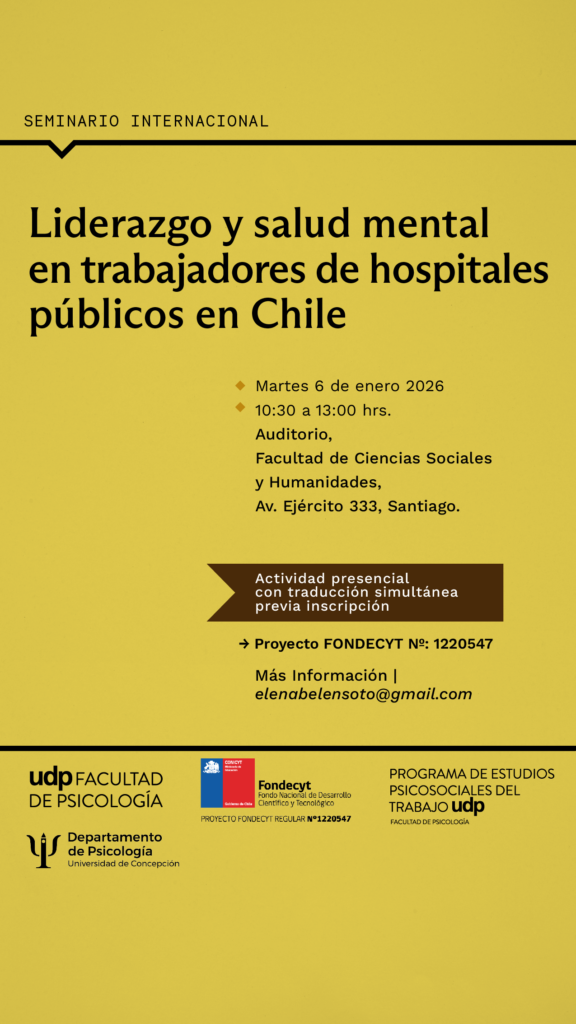 « Todos los Eventos Seminario Internacional «Liderazgo y salud mental en trabajadores de hospitales públicos en Chile» enero 6, 2026 /10:30 - 13:00 « X CONGRESO DE INVESTIGACIÓN DE ESTUDIANTES DE PSICOLOGÍA UDP Lanzamiento libro: Voces del Trauma: Cruces Transdisciplinarios desde el psicoanálisis » INSCRIPCIONES AQUÍ Añadir al calendario Google Calendar iCalendar Outlook 365 Outlook Live Detalles Fecha: enero 6, 2026 Hora: 10:30 - 13:00 Categoría del Evento: Actividades Facultad Organizador Programa de Estudios Psicosociales del Trabajo Udp Ver la web del Organizador Local Auditorio Facultad Ciencias Sociales Ejercito 333 Santiago, Chile + Google Map